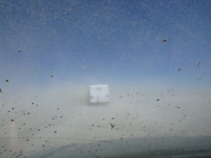 I missed the actual first day (August 29) because I met with German friends on vacation in South Lake Tahoe first. When I finally left for the desert, I was by far more anxious about the drive than anything else. I don’t like driving and had never done 280 miles by myself. But I managed and arrived around lunch time in white-out conditions, the wind blowing the fine desert dust so fiercely that I could hardly make out the car in front of me and the greeter station when it came up. There I was invited to hit a bell and proclaim “I am not a virgin anymore!” Well, that’s true after all.