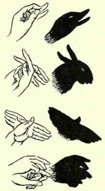 When people make shadows of ducks or rabbits or faces on the wall, we all think they are very clever indeed.Well, let's make some ourselves! All you want is a wall for the shadows, a bright light behind your hands—and your hands themselves. Now, are we ready? Then let's make a duck with just one hand.Isn't it easy? Just touch your thumb with the tip of your bent first finger, bend down the middle finger out of the way, and let the other two fingers stand up, as in the picture. Hey presto, there's a duck! Its beak is open, it is quacking. (But it is really you who are quacking.)Now a rabbit. Two hands for this, please, and put them exactly as I have drawn for you in the picture. That's right—and here's the shadow rabbit, ears and all. Good, isn't he?Now we'll have a butterfly with fluttering wings. Can you make it? Of course you can!And now a funny face, with a pointed nose! Do you see how to put your hands? You do—and there's the shadow-face on the wall, nose and all!You'll have to practise a bit before you can do the shadows really well. It's fun, isn't it?