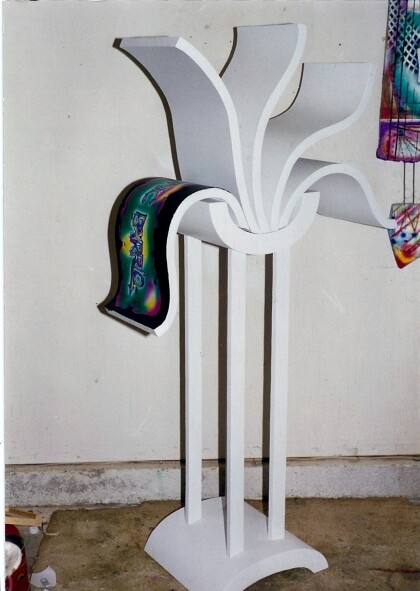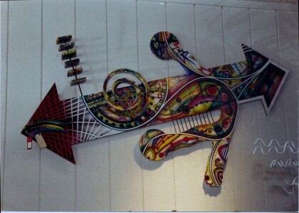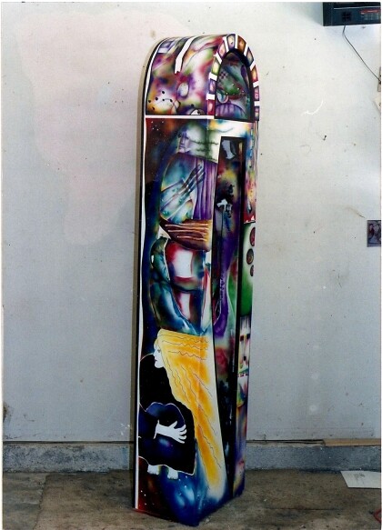 I did this piece in 1992. I built the "superstructure", complete with working clockworks, pendulum, and weights. Then I began masking areas off and airbrushing it section by section. Visible on the side is one of the muses.