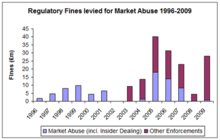 Regulatory fines imposed for market abuse in the UK 1996–2009. Source: from IMRO/PIA/SFA annual reports in LexisNexis 1996–2001; FSA Annual Reports, Appendix on Enforcements, 2003-2012. Further details in Tonks (2010)[61]