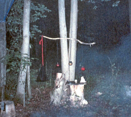 Considering the effects you might want, you go to a craft store or maybe something like a Pier One Imports, and find some glass globes. Nothing too big or too small as it has to hold a candle completely inside of itself. In times past, the old green glass fishing floats were used and you might still find some of these. Green, blue or red is what you want. You’ll want some uniformity in your color choice. Too many other colors and they look like party lights and the effect is lost. Next we appropriate some black candles… not for purposes of black magick, mind you. We want the light within our globes to appear as a single floating point as opposed to an illuminated stem holding it up and immediately identifying it as a candle. Using hot wax or using glue or epoxy, you may want to fix something to hold your candle in place in the bottom center of your globe. Now we have to get handy with a means to carry and suspend our ghost lights (pelen tan) and those of you skilled in macramé will probably fare better than the rest of us in this part. We’ll need a fire resistant material like leather thong or a fine chain (nothing shiny please) to create a web basket that won’t obscure your light going up about 18 inches to a knot where you can make a hook out of an old wire hanger to suspend your light in your nemeton and hold it through the procession without getting burned. The candle flame should be centered within the globe and not extending through the brim of the glass. Darken your chain or thong to render them invisible in the darkness and in only a short distance, you create the illusion that these balls of light are floating of their own accord.