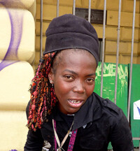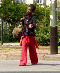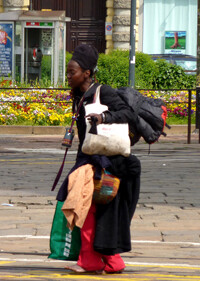 for ingredients to prepare that evenings meal. On the slowly descending escalator I had ample time to sense her presence even before I saw her smiling face. Just set aside to the right of the landing, along the entrance wall, were numerous bags holding her possessions. I recognized the green and purple duffel from Alaska as belonging to the lively black woman I've come to think of often. As I combed the aisles dropping items into my basket, I came across her speaking with another customer by the abundant cheese section. Our eyes met. I nodded and in return she flashed her effervescent grin, showing up close for the first time the rotting teeth and toothless gaps. It wasn't in recognition of the American who saw her so frequently in our common town, it was just Silvia's way.