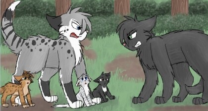 queens: spottednose (26 moons) silver spotteded she~cat mate: stonefeather kits: leafkit (1 moon) tan she~cat with leaf green eyes, patchkit (1 moon) dark gray spotted tom, and furnkit (1 moon) a silver she~cat webpelt (29 moons) a dark gray tabby mate: Scorchingechokits: Fallingkit (5 moons) a tabby tom