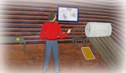 The painting showed the inside view of an ancient log cabin distorted by time, with small unseeing ivy-covered windows. There were also old leaves scattered on the floor in a space empty of furniture.