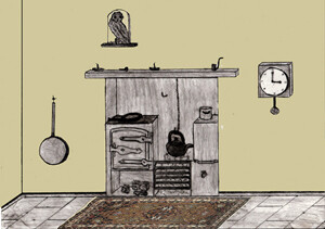 On the wall to the left of the table, there was a wide chimney breast, and inset into it was a large black, iron cooking range with an open fire in its centre. The fire apparently heated the oven to the left of it, as well as the water on the right, as there was a large polished brass tap to the lower part of that section. On the hot plates over the oven and the water section, stood a large iron frying pan, several black cooking pots and a huge black kettle which Mrs. Persill was now filling with fresh water from a nearby jug. The kettle was then hoisted â with the skill of constant practice â onto a large hook which left it suspended at the optimum distance above the flames. There was a great deal of headroom above the range, almost five feet from floor level, before the heavy timber mantle shelf jutted out. On this, stood a collection of hand-carved wooden pipes and a few clay ones. Three well-used candle holders with their snuffs sat there as if in readiness for some emergency.