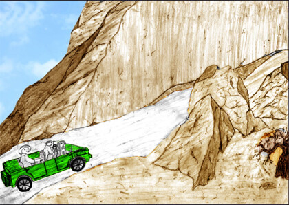 “Yes, that’s it! I must be blind or confused – or both,” he answered. “We’ll have to walk, the ground is too rough – we could lose a tyre or break something.”