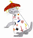 “Stick your hands up,” said a shrill voice from behind him that was trying to sound gruff. The man spun around in panic expecting to look into the business end of a gun. His eyes did a double take at the sight of a talking cat with a sort of dog’s duvet on its head, and a mystical patterned shawl.