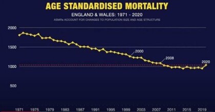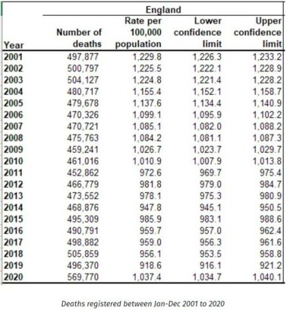 Fortunately, following a freedom of information request, on 12 January the Office for National Statistics published a report on āAnnual number of deaths, crude and age-standardised mortality rates, deaths registered in England and Wales, 1838 to 2019 (final) and 2020 (provisional)ā. This shows that the age-standardised mortality rate in 2020 of 1,043.5 deaths per 100,000 of the population was surpassed not only in 2008 (with 1,091.9 deaths per 100,000), but also in 2007 (1,091.8), in 2006 (1,104.3), in 2005 (1,043.8), 2004 (1,163.0), 2003 (1,232.1), 2002 (1,231.3), 2001 (1,236.2) and 2000 (1,266.4).