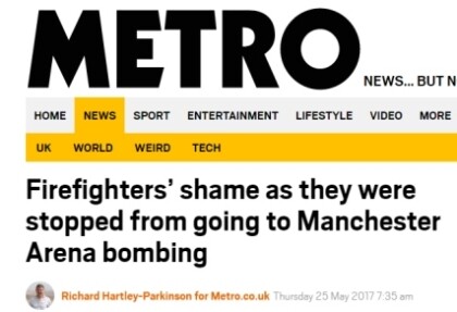 “The members of the emergency service (Fireman) have told the Manchester Evening News they were aware paramedics were in urgent need of back up in the aftermath of the terror attack - but they were prevented from going in. Devastated crew members have said that by the time five appliances were sent to the scene, all the dangerous work had been done. But crews claim all they could do was watch the horror unfold on TV - just half a mile from the scene”.