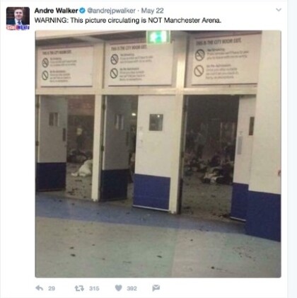 At around the same time this tweet appears about Manchester from columnist/lobby correspondent at The New York Observer Andre Walker. He clearly states on his Twitter account that this image is fake.