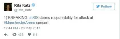 Again as the Westminster attack the ‘official ‘ announcement as to who did it (ISIS) had to appear on the Rita Katz website – at 4.44 am on 23rd of May, Just hours after the attack. As mentioned earlier Rita Katz is Jewish whose father was a Mossad spy. Here is her Tweet.
