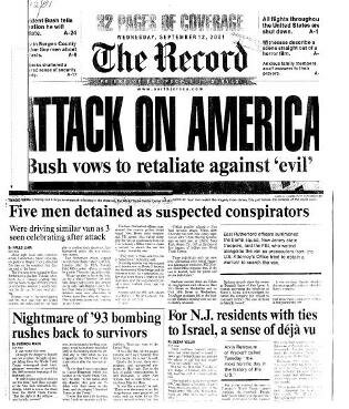 Below a newspaper showing the headlines about the 5 Israeliās that were arrested.