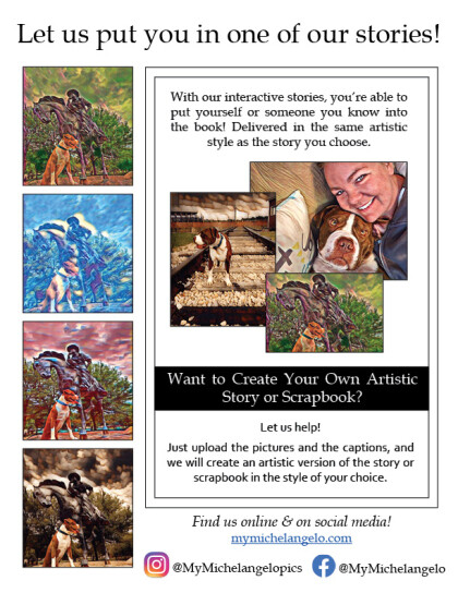 2020 has turned out to be a very challenging year for the majority of the world, and I was no different. Soon after the pandemic hit, I lost a job that I loved and was hugely passionate about. I felt lost and adrift in a time that was, quite frankly, pretty bleak. I walked my dog a lot during those early days of unemployment. I always enjoyed my outings, not only because it got me out of the house, but also because people were always happy to see my dog. Wherever we went, people smiled and seemed to come alive. This was my inspiration. I needed to get back out there and start doing good again. To tell stories that are fun and heartwarming. That was the inspiration for these books and our website. I thought we could do more. Allow for the reader to do more. Give readers not only good stories but ownership and creative control over their material in a way that hasn’t been done before. We are constantly trying to innovate. To allow readers to push the boundaries between art and reading. In doing so, we created Mymichelangelo.com.