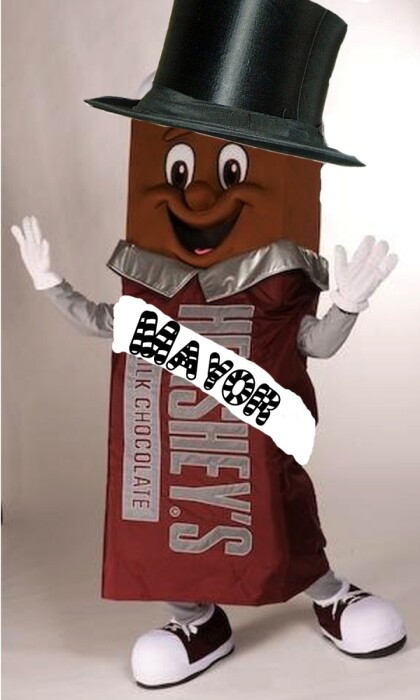On the right side, we see Mr. Hershey, with a top hat and a sash across him that says Mayor*
