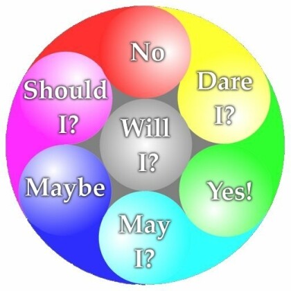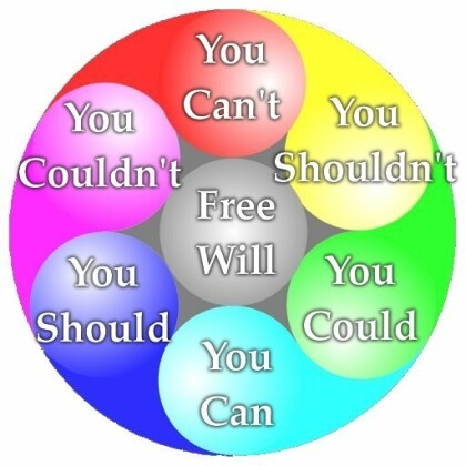 Life is something which most people consider to be 'out there' where everything seems to happen. The moment we turn inwards, reality seems to fade away, leaving you something that one cares to call solitude, and the other loneliness. Although I occasionally love to return to solitude and silence, it is no better or lesser component of Life than our everyday environment. Most of us may feel that at times we have no free will, and yet we truly respect the existence of it in others: if I play my music too loud on the train, a fellow passenger may ask me to turn it down. Since I had the intention of listening to Ayreon at the level it should be played (to my taste), I turned it off instead, at which time the complainer indicated that he didn't intend to make me stop listening. No, but that's free will for ya: the continuous possibility of choosing to comply, refuse, or do 'none of the above'. So yes, the first layer of difficulty in Free Will is the set of constrainers and enablers where people around you (and all their various laws and decrees) will try to nudge you into certain directions. But you guessed it already, the ultimate decision is always yours: either adapt, or take a stand. Or, like Ellie (I'm watching Contact) is just answering her friend when he asked her why she wants to go on the mission: because there is nothing in her heart that she would rather do! Now in the diagram above, the six surrounding spheres are the do's and dont's that our environment rewards us with. Mostly, like all aspects of the Cosmos, they are perfectly balanced, so in the end no influence of the environment throws us off balance. In this case, I've arranged the three pairs of responses in such a way that the restrainers are on top, and the enablers are on the bottom, basically because we usually build on the enablers, and have to try and break through the restrainers. The pyramid of humans, remember? But setting them to surround us is equally valid of course, maybe even more so. Of course the six alternatives are way more effective if there is additional data following them, but that is another issue.
