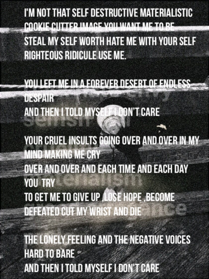 A social outcast, that is thrown away Just yesterdays past,nothing for today I am just a shell,ready to be admired lied,broken,abused, I am tired ready to give up, ready to go away Crying to death,for him,to take me away today No one even care, who I am inside Or even why I want to hide All my joy, happiness ripped out of me... All my thoughts of love, marriage kids gone.. No one even cares,if i cry, no one stop to see No one one knows who I really am. or why? Or why I am so depressed and want to die or why i even cry at night or why everyday is a fight No one know why i set here, with a broken heart No one what inside of me, why i feel so riped apart... NO one knows why i feel so alone, so confused , so tired, so trusted , unloved and abused.