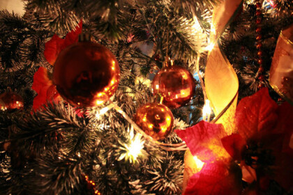 Between the Christmas tree