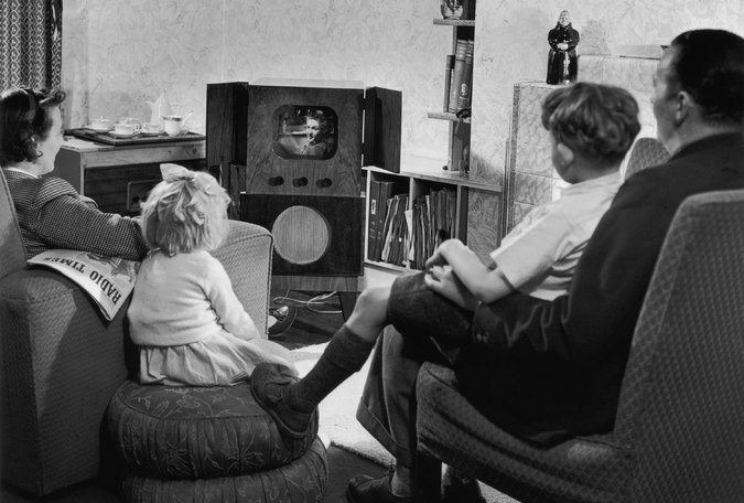 A family watching television together in 1950. The average time Americans spent watching TV in 2014 was 2.8 hours a day. CreditKeystone Features/Getty Images