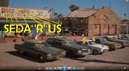 57 Seconds into the intro, my mind exploded! No, I didn't go looking for it, it just hit me in the head like a two by four (and then some)! Seeing the 'USED CARS' sign in this picture, with the U and the C weakened in contrast by the squares immediately handed me SEDA'R'S on a platinum platter. I knew at once it had to be SEDA'R'US, so I was one U short. Well, that was easily fixed with the one boxed U. Hmm, one boxed C still left over. Could it be my dear friend the Cosmos jokingly signing his work? Well, it is his kind of humor I'm used to....